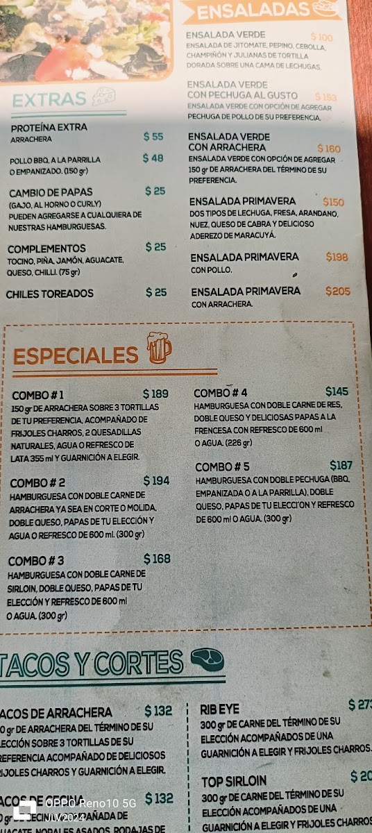 Arrachera de 150 gr sobre 3 tortillas a eleccion. Acompanado con frijoles charros, 2 quesadillas naturales, bebida y guarnicion a eleccion.