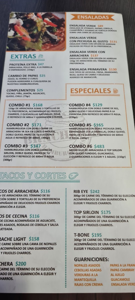 Medio kilo de arrachera con queso fundido, guacamole, 2 porciones de frijoles charros, 2 guarniciones a eleccion y 2 aguas del dia de 500 ml.